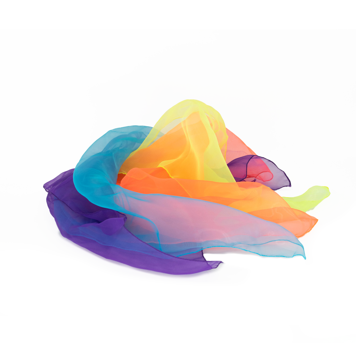 Das 12er Set besteht aus qualitativ hochwertigen Jongliertücher in 4 Fluo-Farben: Orange, Blau, Lila und Gelb.