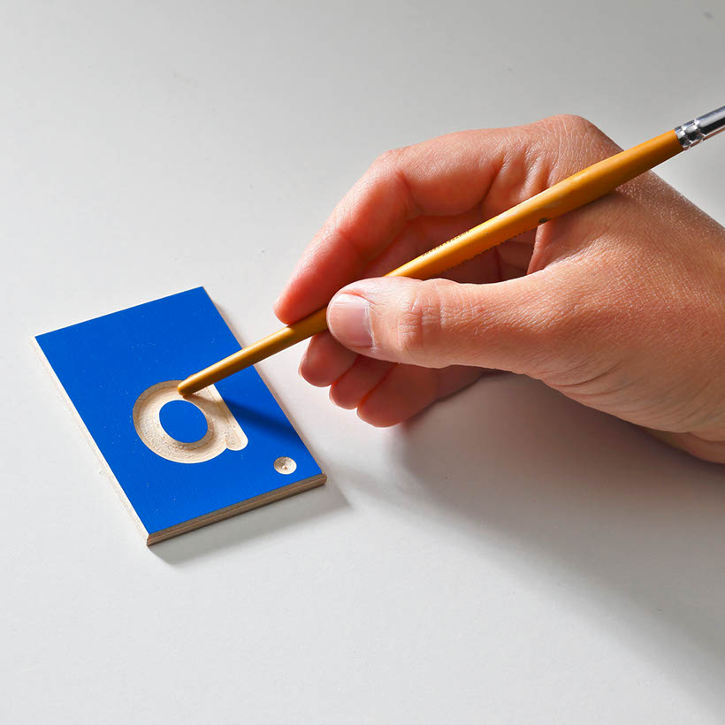 Tipp:Liegt der Markierungspunkt auf den Holztafeln rechts unten, ist garantiert, dass der Buchstabe nicht Kopf steht.