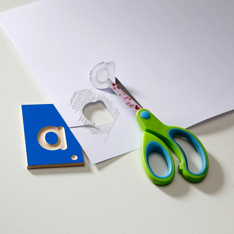 Das Durchzeichnen und anschließende Ausschneiden, Basteln oder das einfache Nachfahren mit Stift-Enden (Formerfahrung) verinnerlicht den Buchstaben.