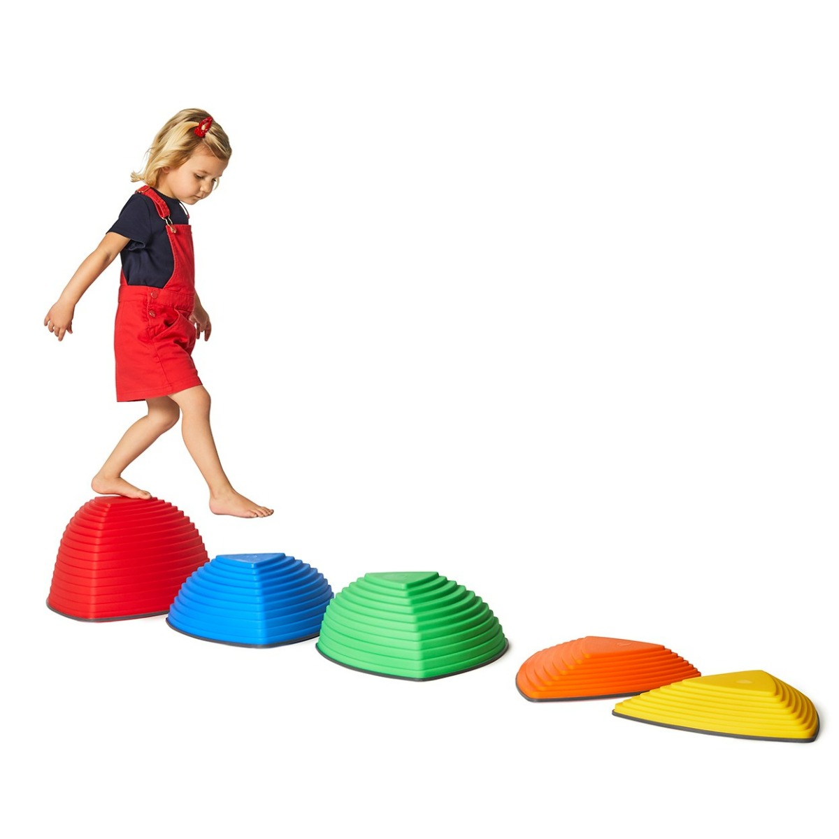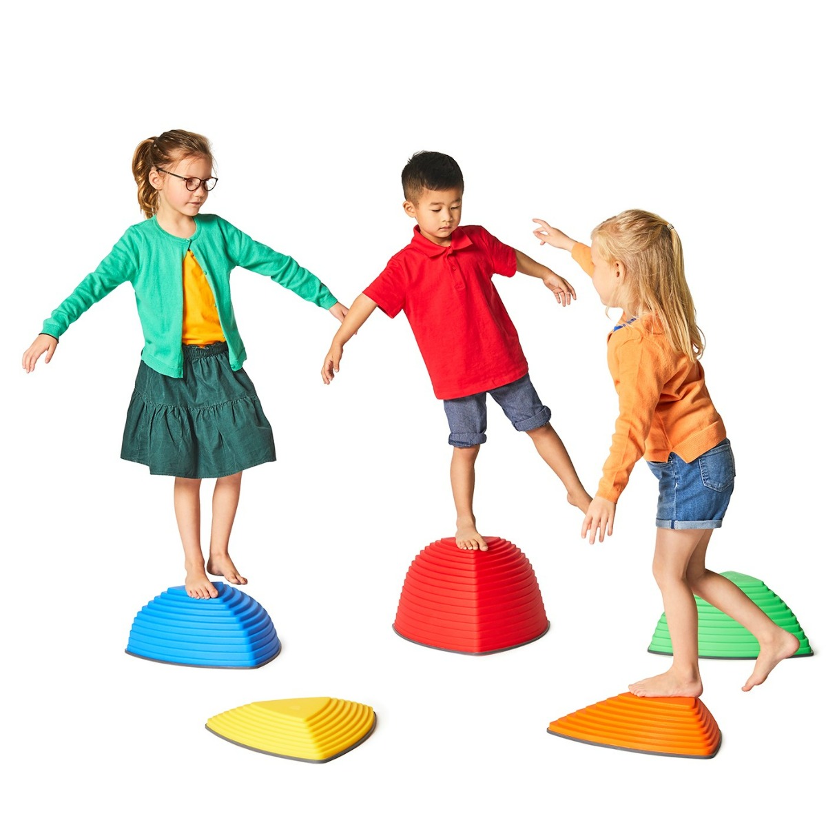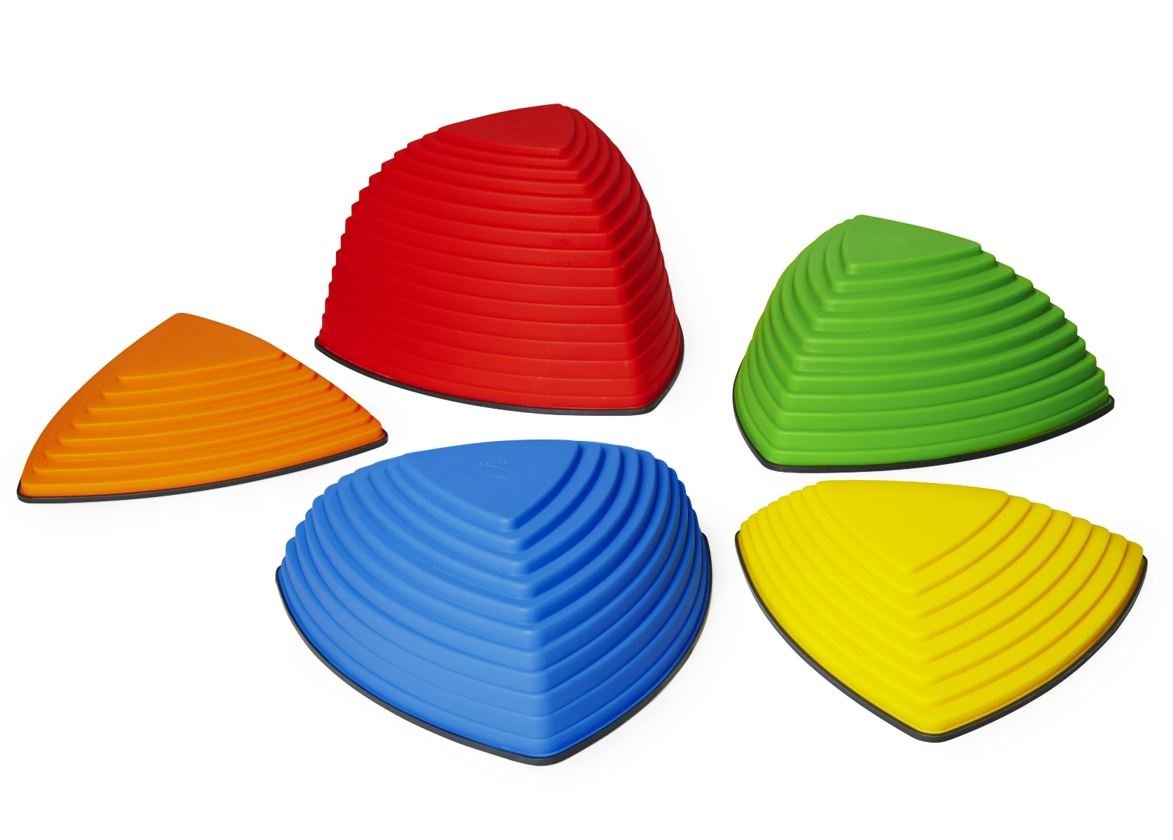 Fünf Hügelkuppen in verschiedenen Höhen, die Kinder dazu anregen, von Gipfel zu Gipfel zu springen oder zu steigen und die Balance zu halten.