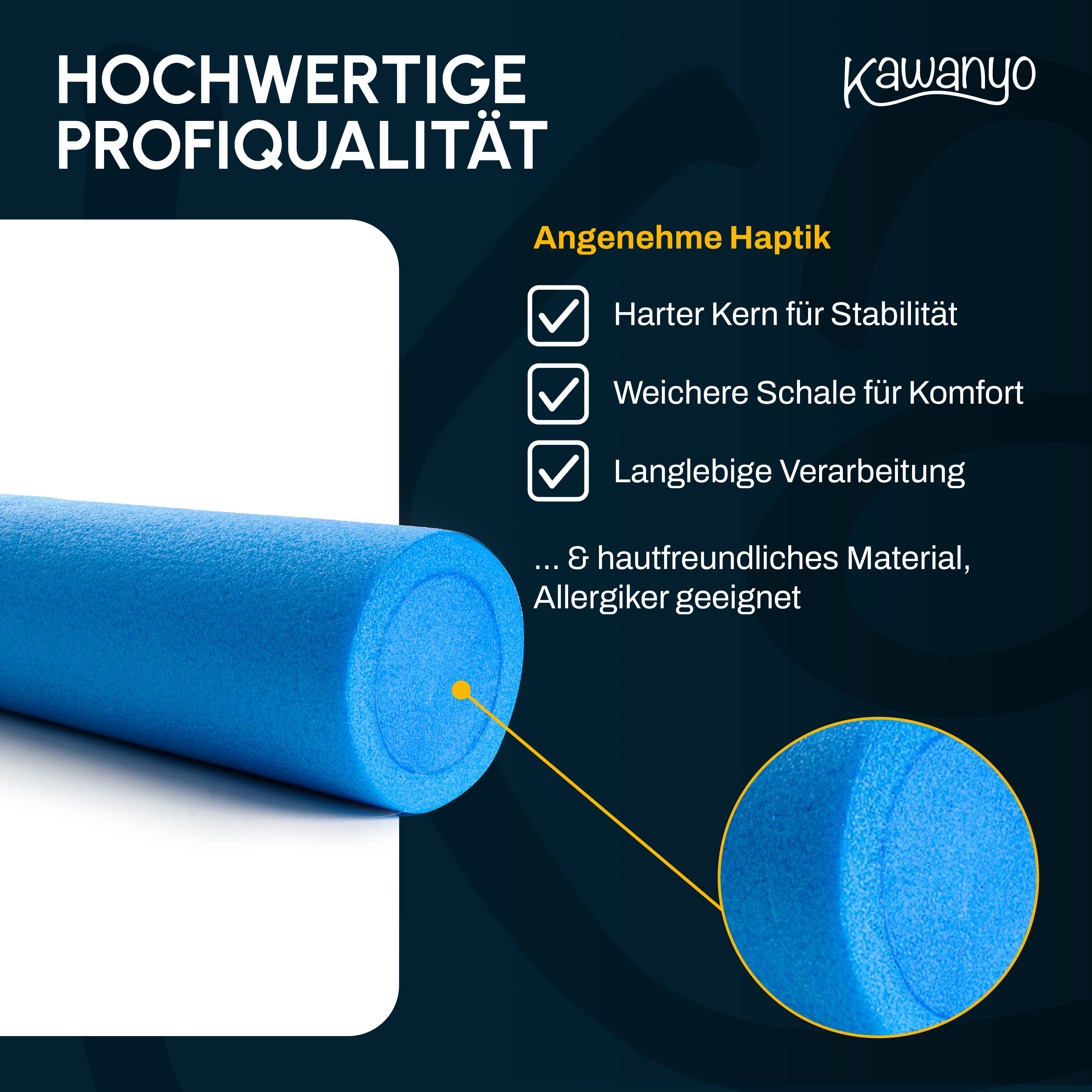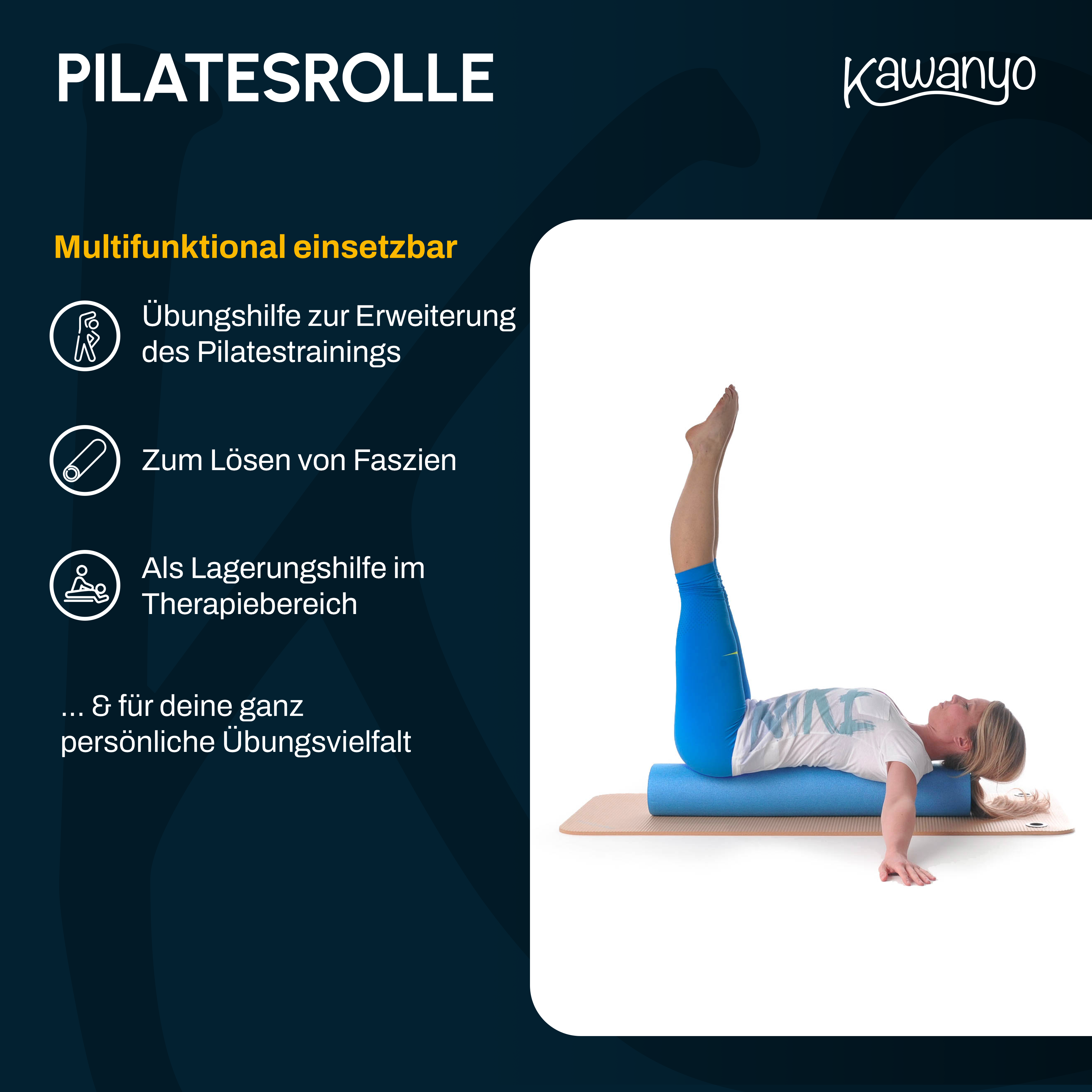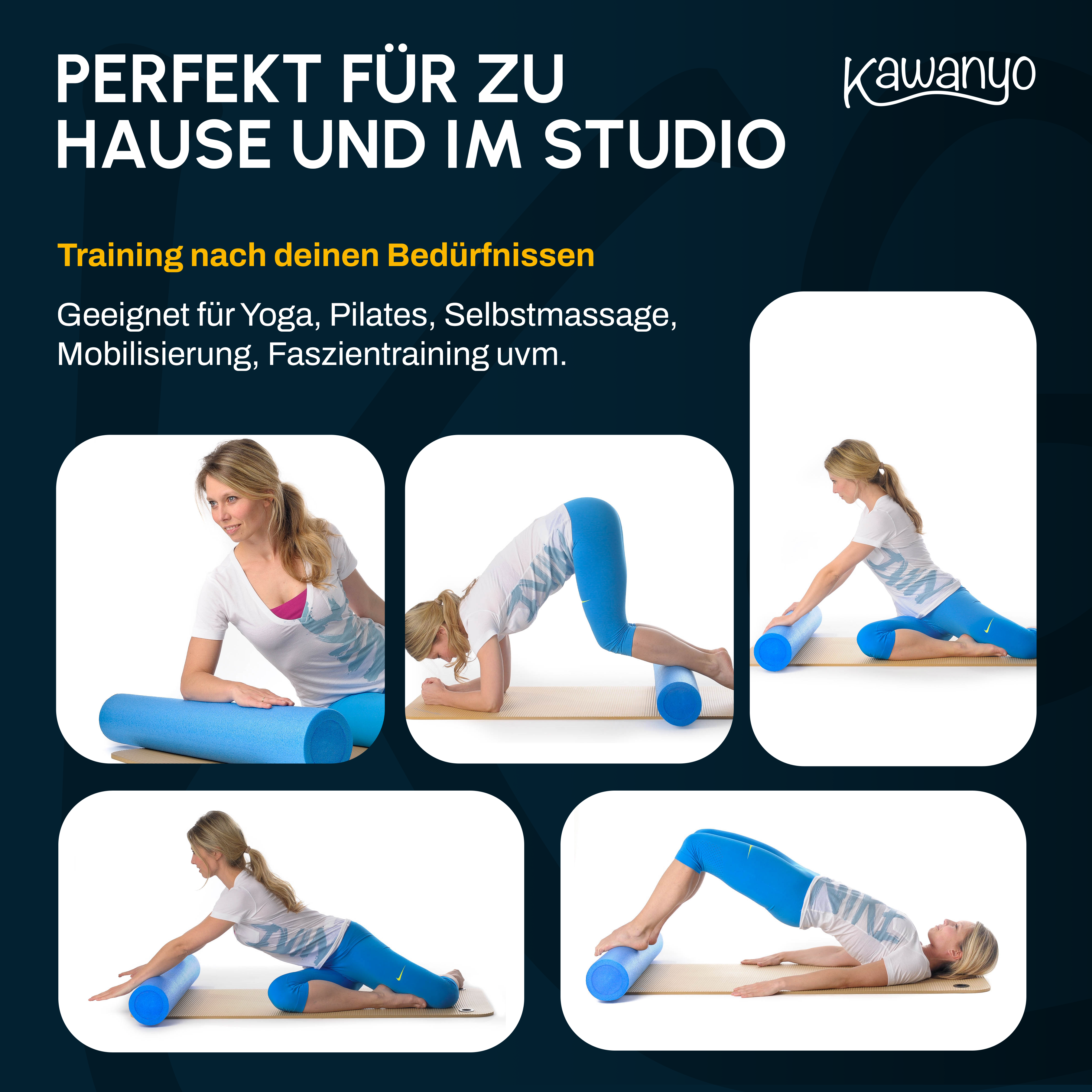 Optimize your training with the 6-piece set of Kawanyo Yoga & Pilates Rollers 90 cm including a carrying strap – perfect for balance, stability, fascia work, and group training.