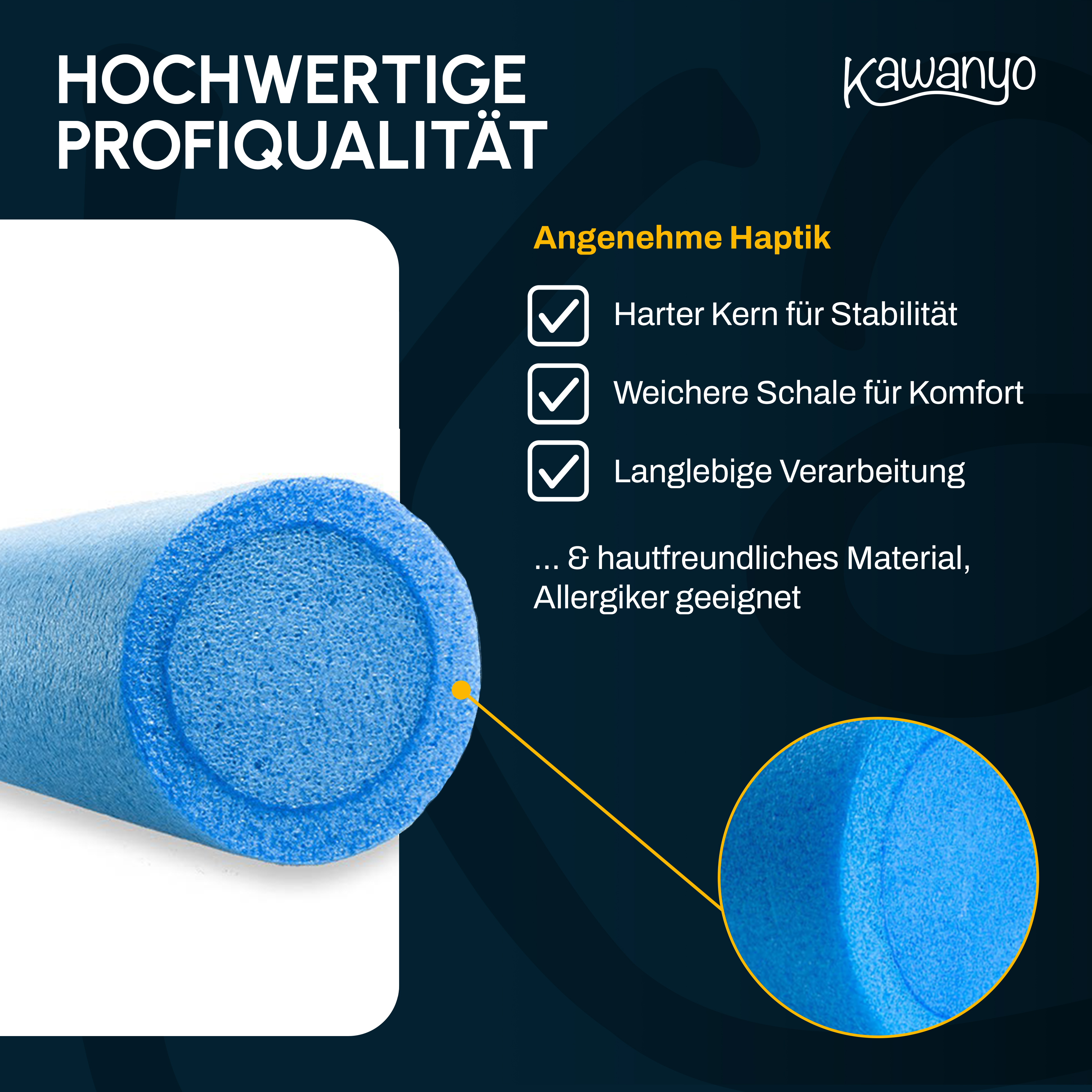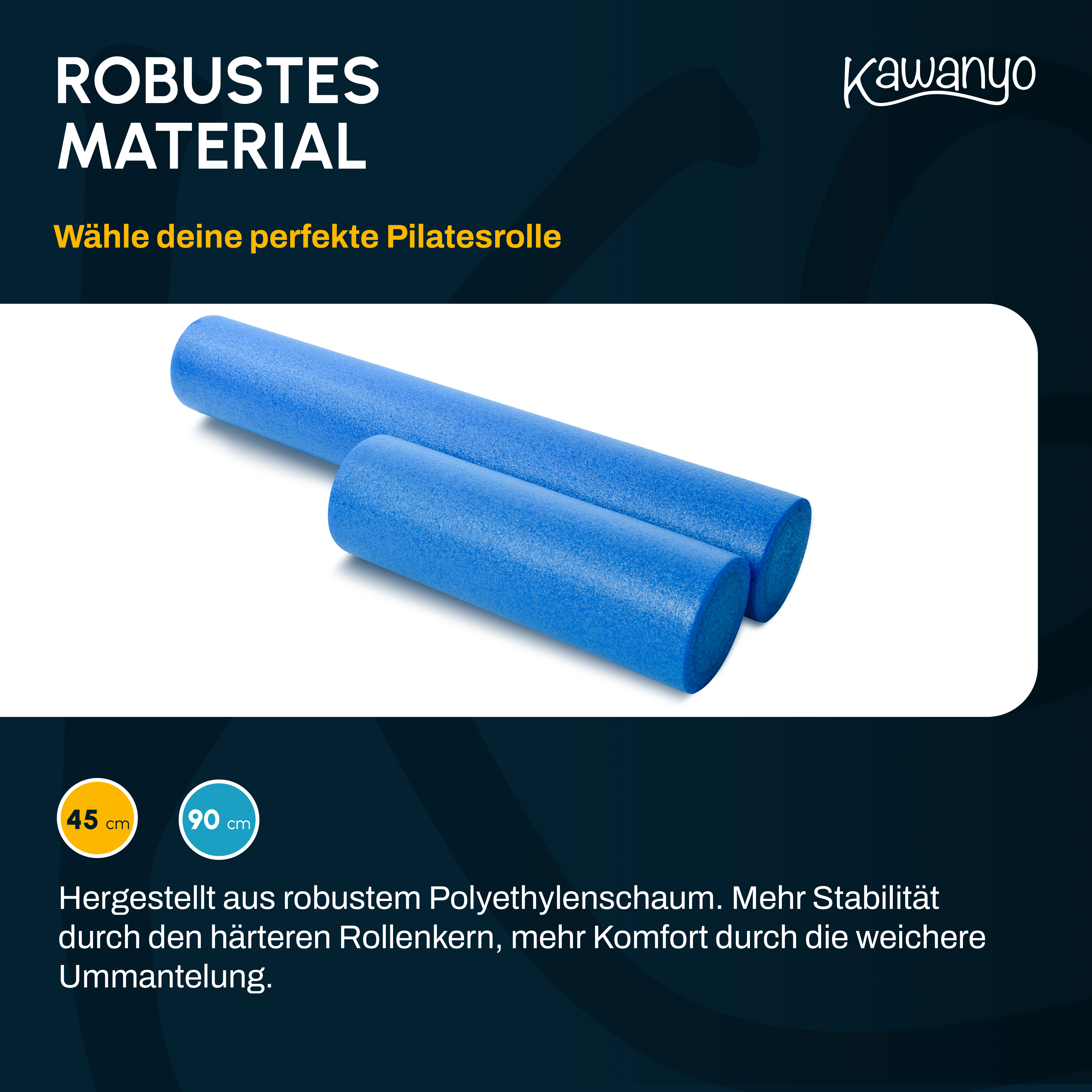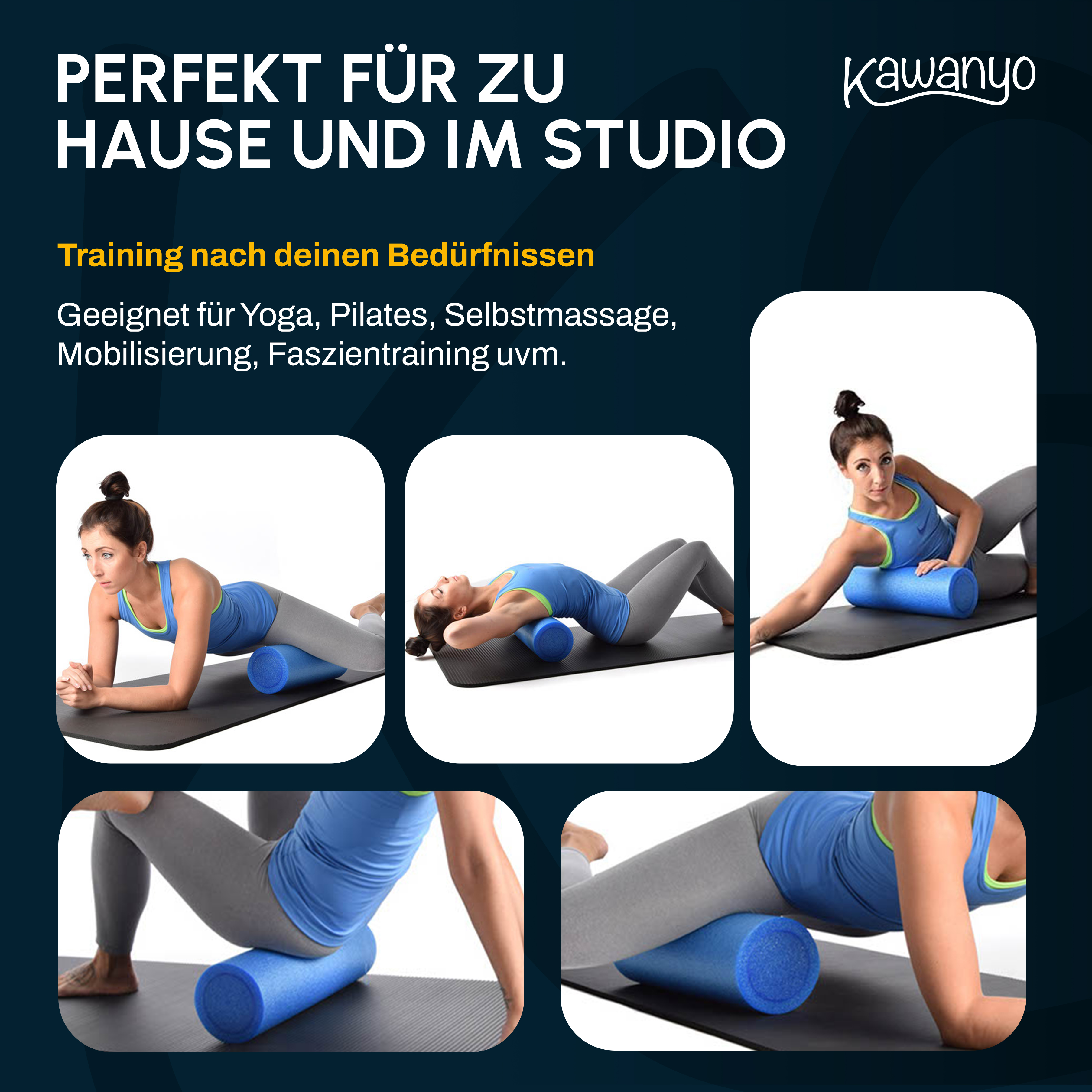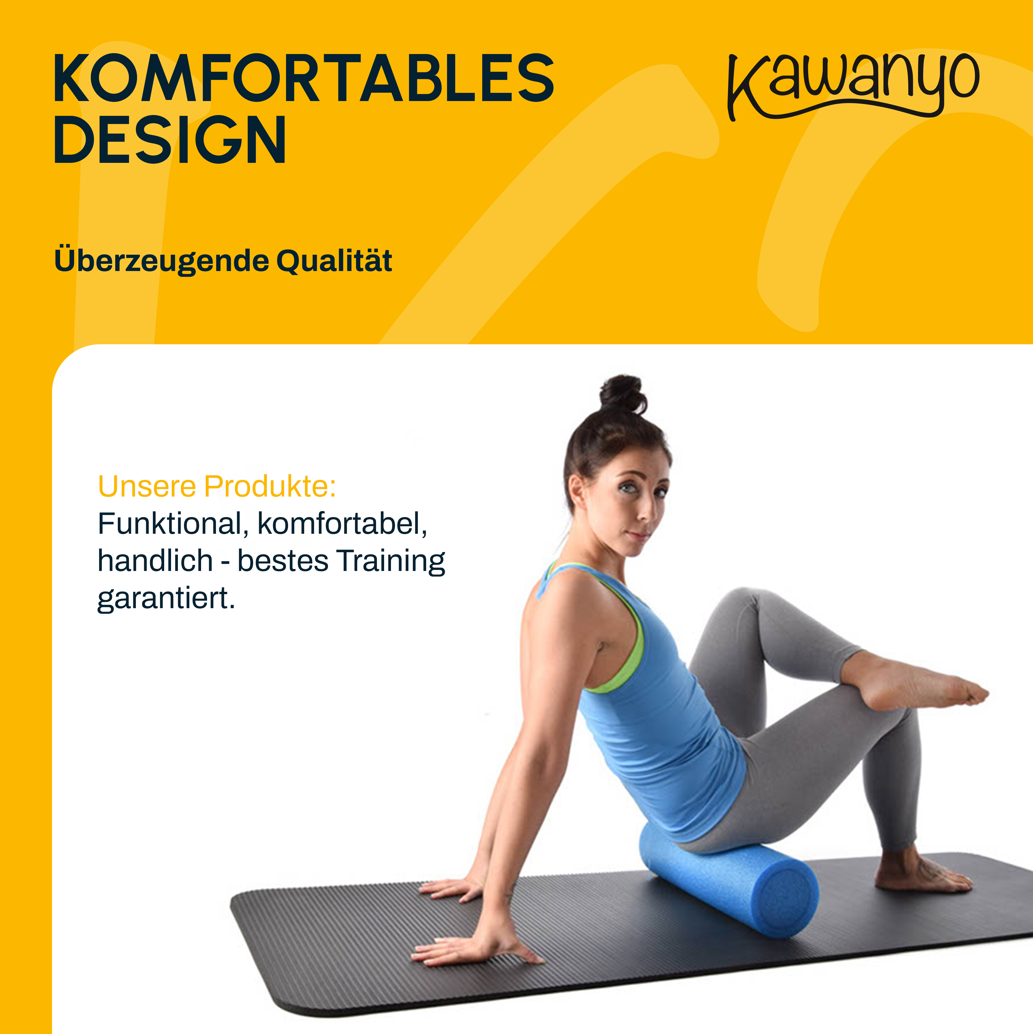 Formstabile, hochdichte Fitnessrolle zur myofaszialen Selbstmassage. Die 45 cm langen Kawanyo Rollen sorgen mit ihrem härteren Kern für Stabilität während deines Workouts, während dir die weichere Ummantelung den nötigen Komfort bietet. Du kannst die Rolle perfekt als Einsteiger-Faszienrolle einsetzen. Aufgrund ihrer Materialbeschaffenheit lässt die Rolle aber auch den Einsatz als kurze Pilatesrolle zu.
