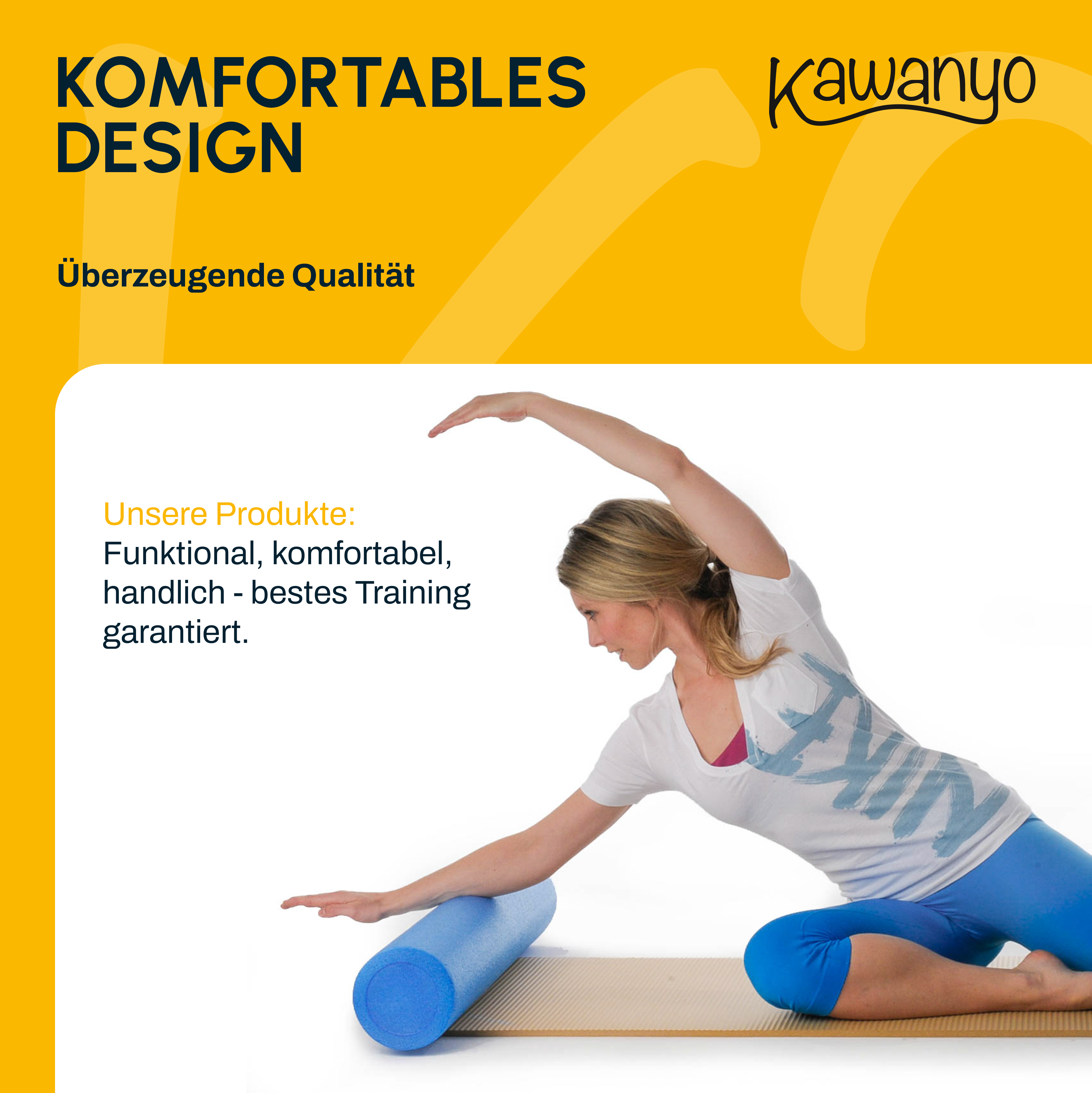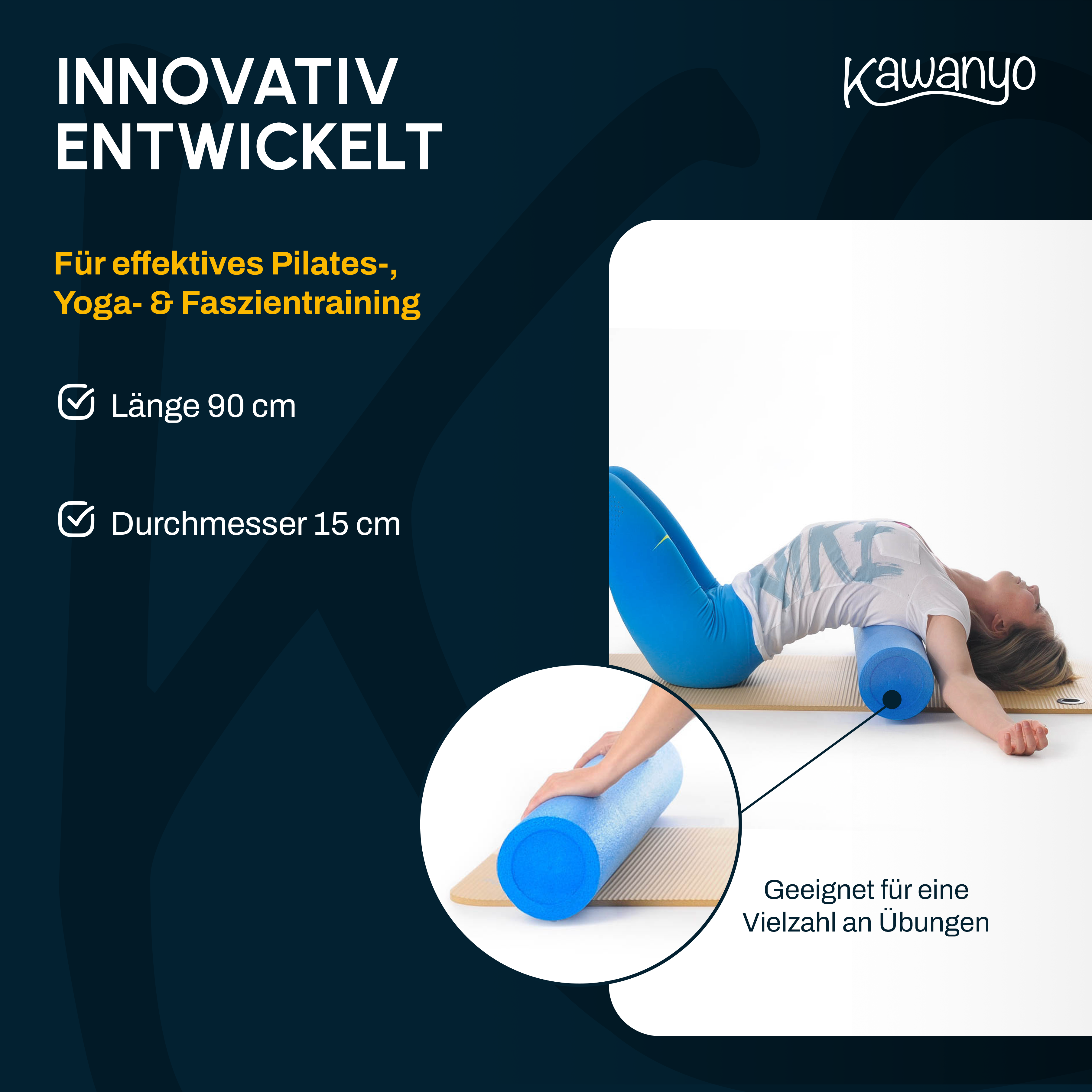 Nutze die Kawanyo Yoga- & Pilatesrolle 90 cm für vielseitiges Training: Balance, Stabilität, Faszien und mehr – ideal für Einsteiger und Fortgeschrittene.