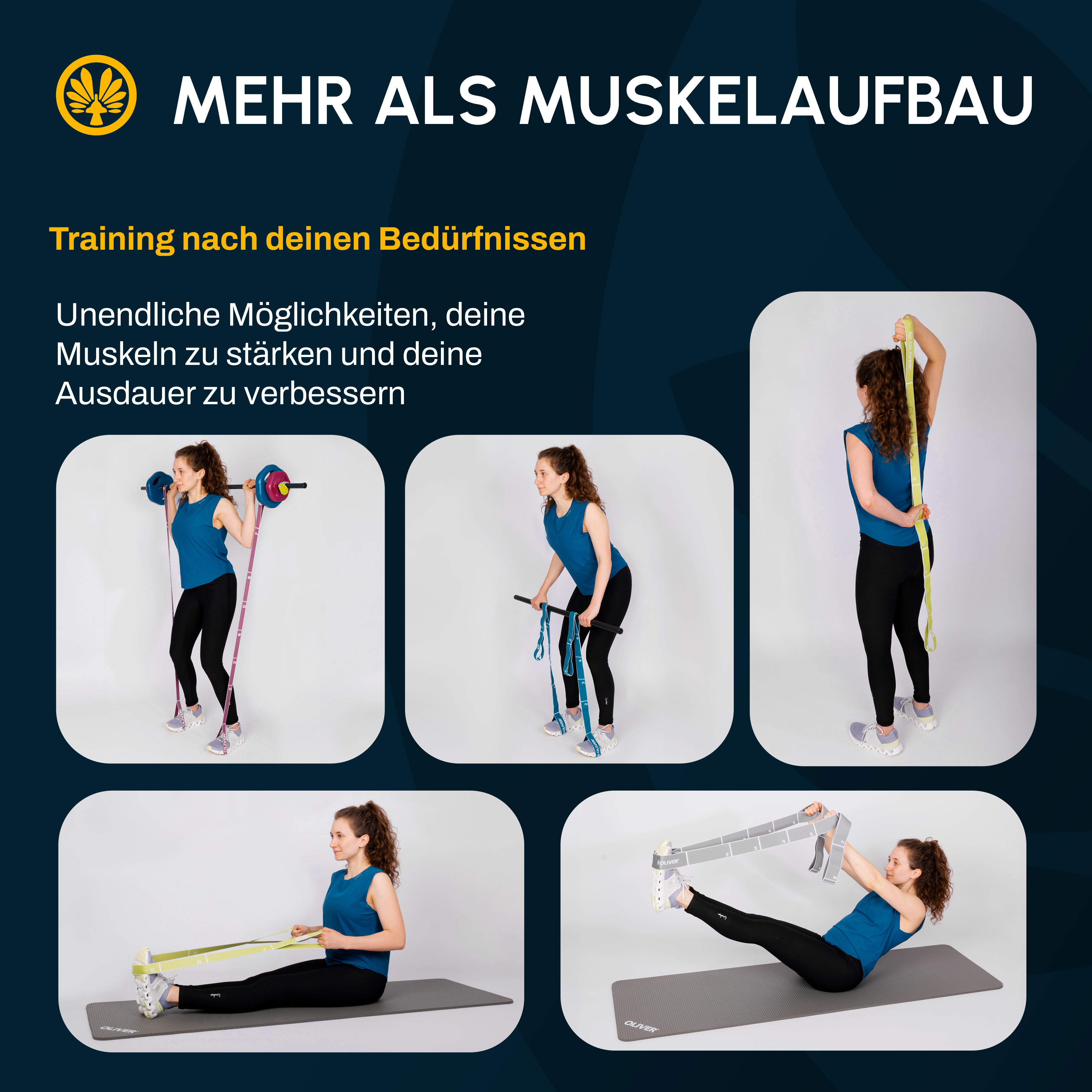 Mit 2 Tex-O Bändern gibt es die Möglichkeit seitengleich zu trainieren. Zusatzgeräte wie Steps, Langhanteln, Pezzibälle oder Gewichtsstangen erweitern das Tex-O Maxiband Training effizient. Entscheidend ist immer, dass die Auswahl des Widerstandes an die jeweilige Übungsvariante sinnvoll angepasst wird.