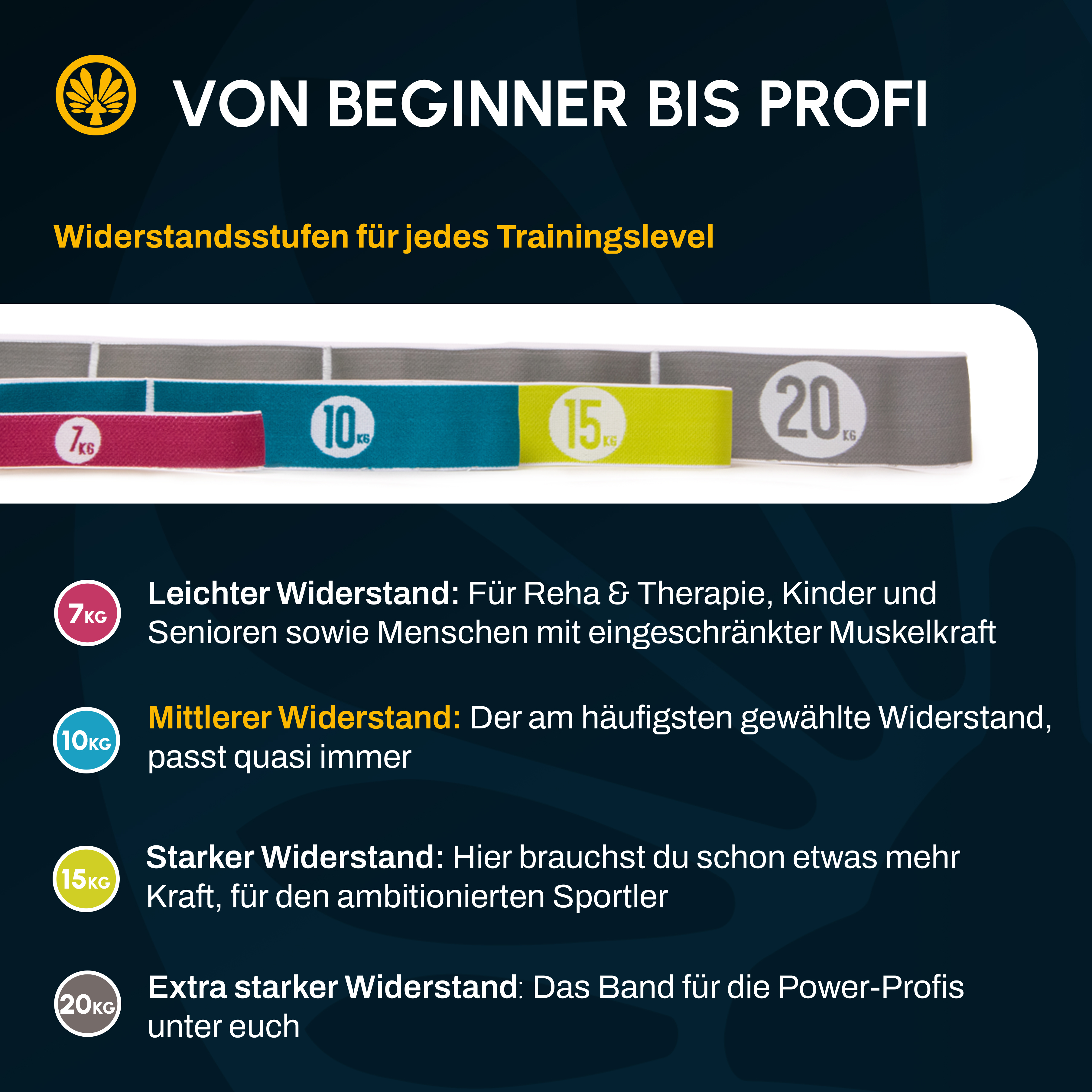 Die Wahl des Widerstandes sollte an die Übung und die eigenen Fähigkeiten angepasst sein, außerdem ist nicht jeder Muskel im Körper gleich stark. Deshalb: Für optimale Trainingsergebnisse sind Bänder in verschiedenen Stärken nötig.