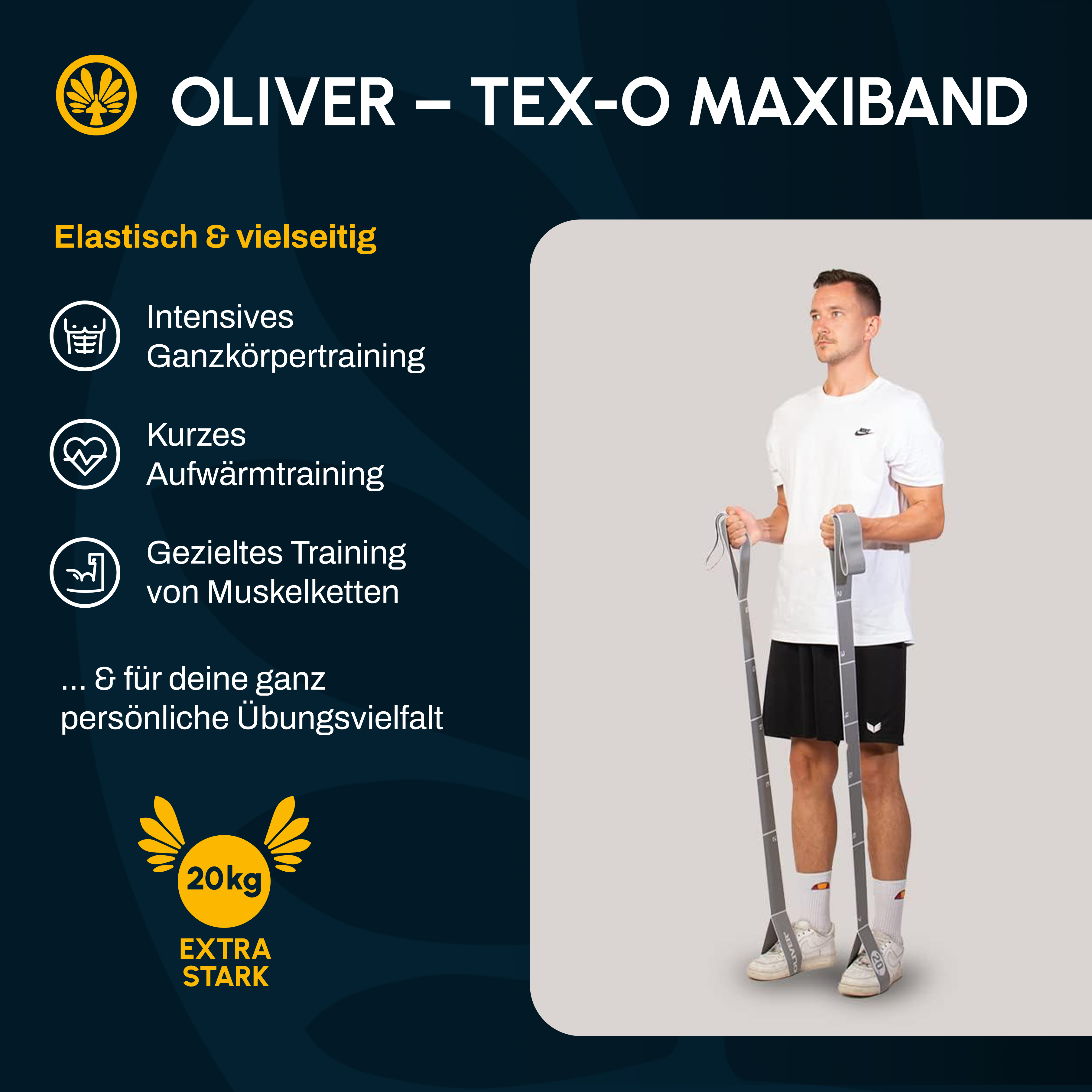 Das aufwendig entwickelte OLIVER Tex-O Maxiband ist ein elastisches Fitnessband mit 8 Schlaufen. Das Schlaufenband ermöglicht ein intensives Ganzkörpertraining, ein kurzes Aufwärmtraining oder ein gezieltes Training von ganzen Muskelketten. Die Übungsvielfalt entsteht durch die große Kombinationsauswahl der durchnummerierten Schlaufen und deren Einsatz an Hand, Fuß oder Oberschenkel. Die vier äußeren Schlaufen wurden bewusst größer gewählt, damit der Einstieg auch mit Turnschuhen leicht fällt.