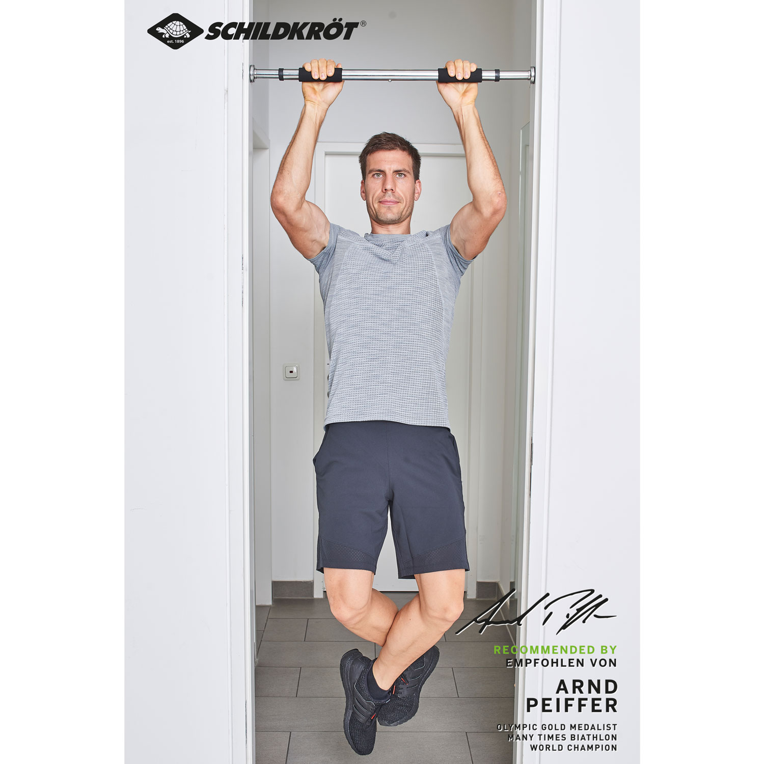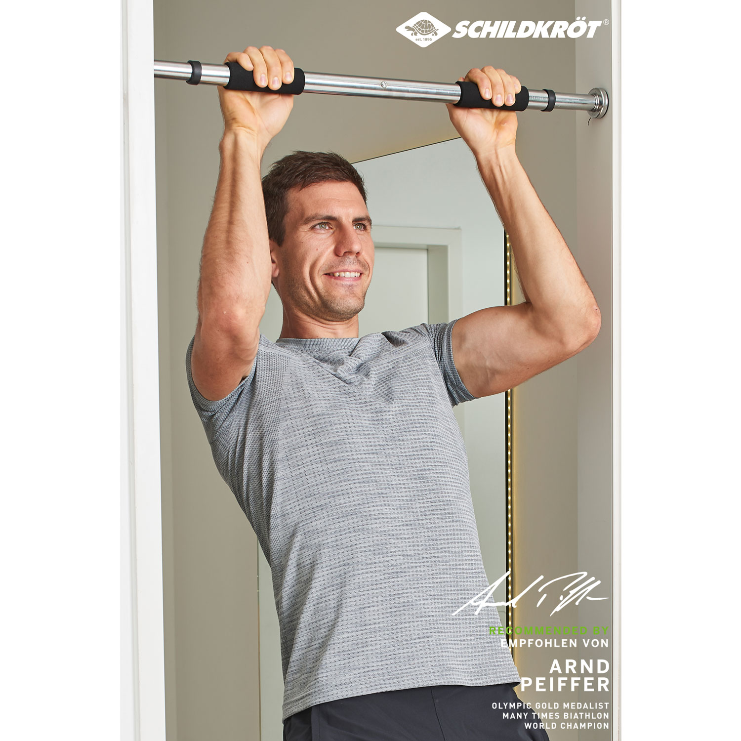 Diese Klimmzugstange eignet sich für das Trainieren der gesamten Oberkörpermuskulatur und kann vielseitig als Gymnastik- und Turngerät zu Hause eingesetzt werden. Die Klimmzugstange aus Stahlrohr (Ø 30/25 mm), ist verchromt und hat zwei Griffe aus rutschfestem Schaummaterial. Sie passt in jeden gängigen Türrahmen von 63 bis 96 cm Breite und ist leicht zu befestigen. Die Gummiauflagen an den Enden der Stange dienen zur Schonung des Türrahmens.