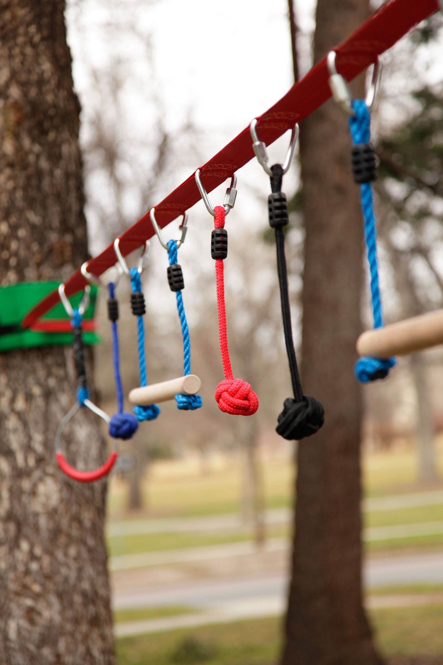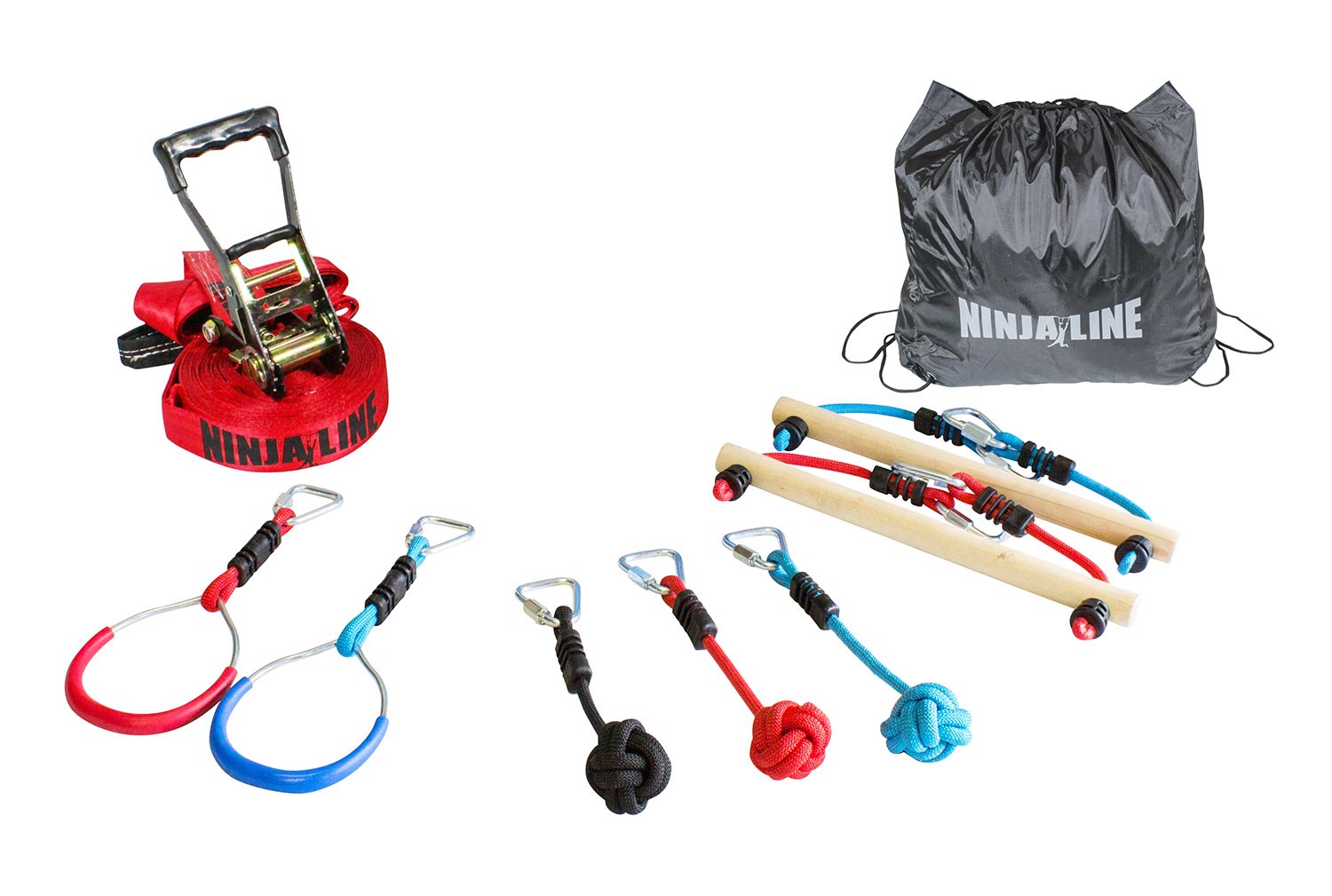 Die Ninjaline von Slackers wurde für vielseitigen Einsatz entwickelt. Du kannst die 7 Elemente nach deinen eigenen Vorstellungen anordnen oder das Gurtband alternativ als Slackline für viele Stunden Spaß und Training verwenden.