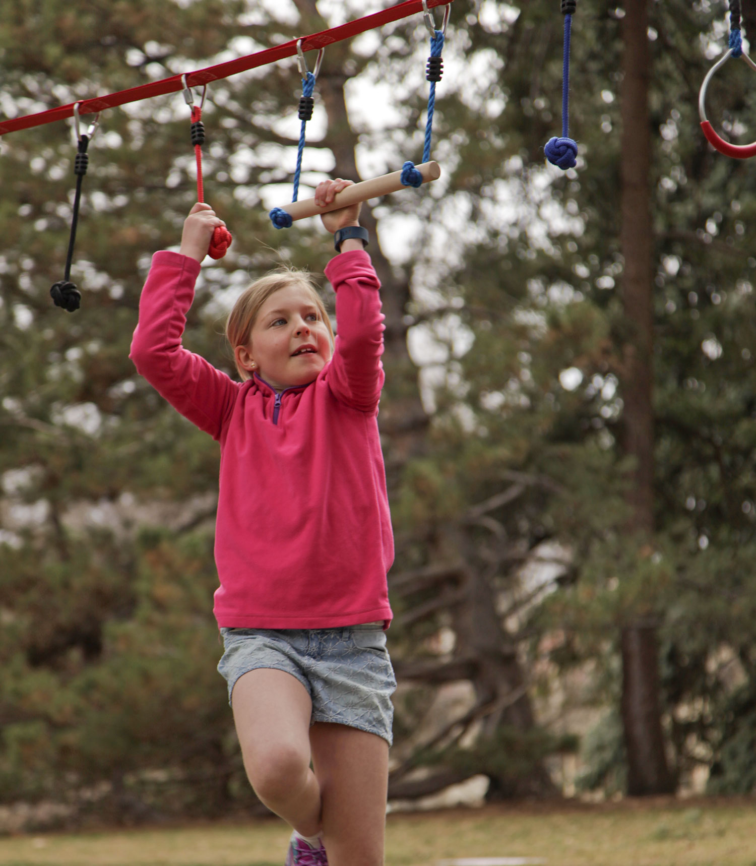 Jetzt seinen individuellen Kletterparcours bauen: Die 12 vernähten Ösen in der Ninja Line bieten den sicheren, unverrutscharen Ort für die fest verschraubbaren Karabiner und ihre jeweiligen Ringe, Stangen bzw. Knoten.