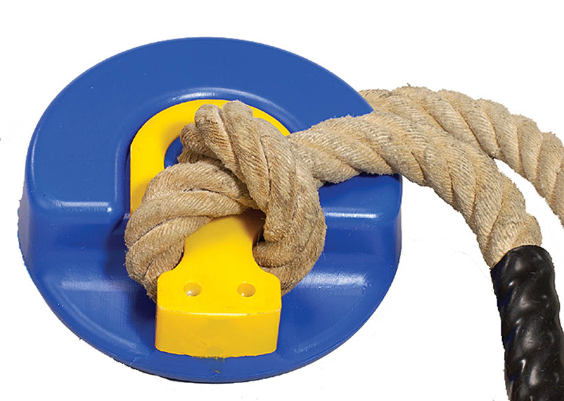 Mit dem SwingTop lassen sich alle genormten Schultaue aufrüsten: einfach das Tauende durch die Öffnung nach unten führen, durch die Lasche und dann durch die so entstandene Tauschlinge ziehen. Fertig ist der Schaukelsitz!