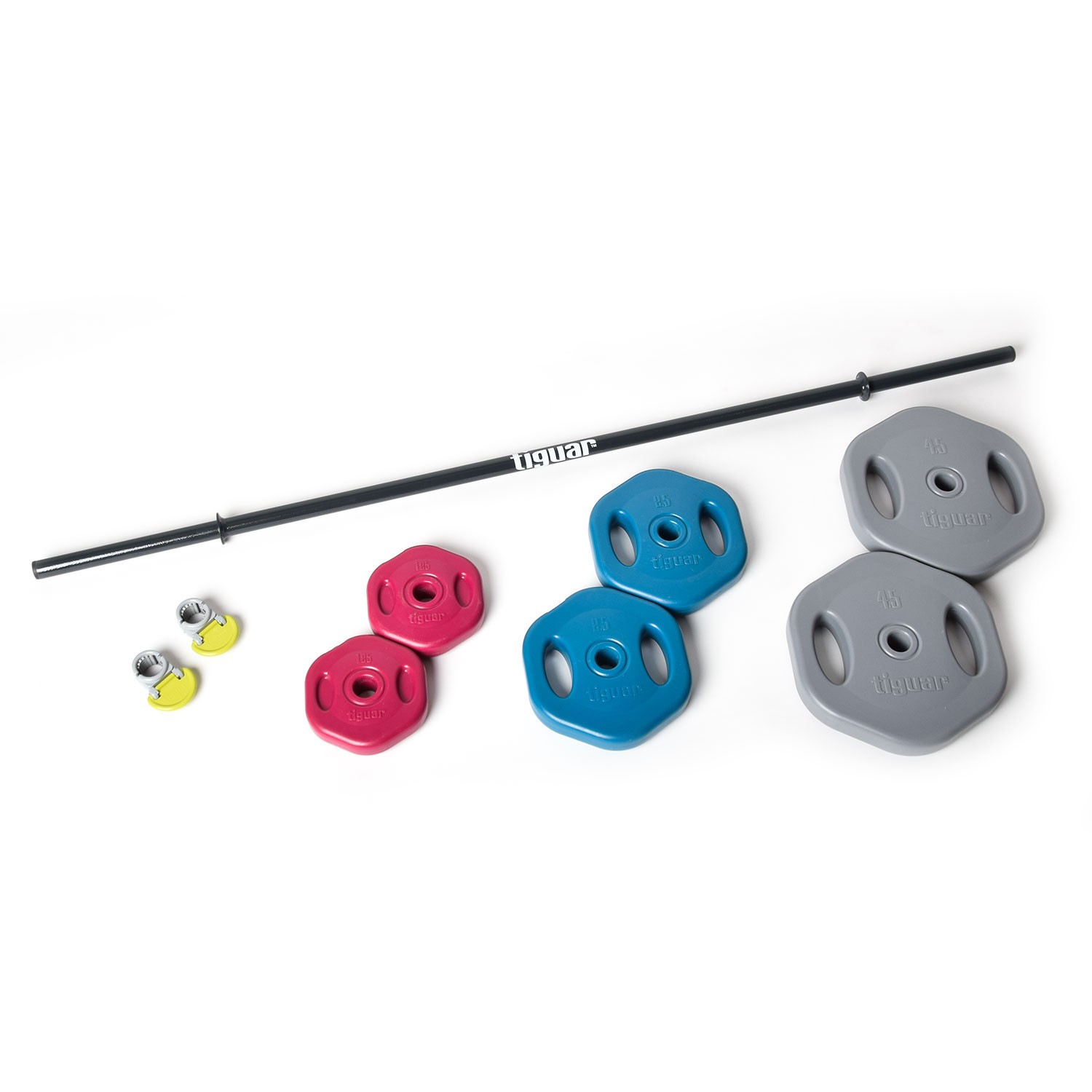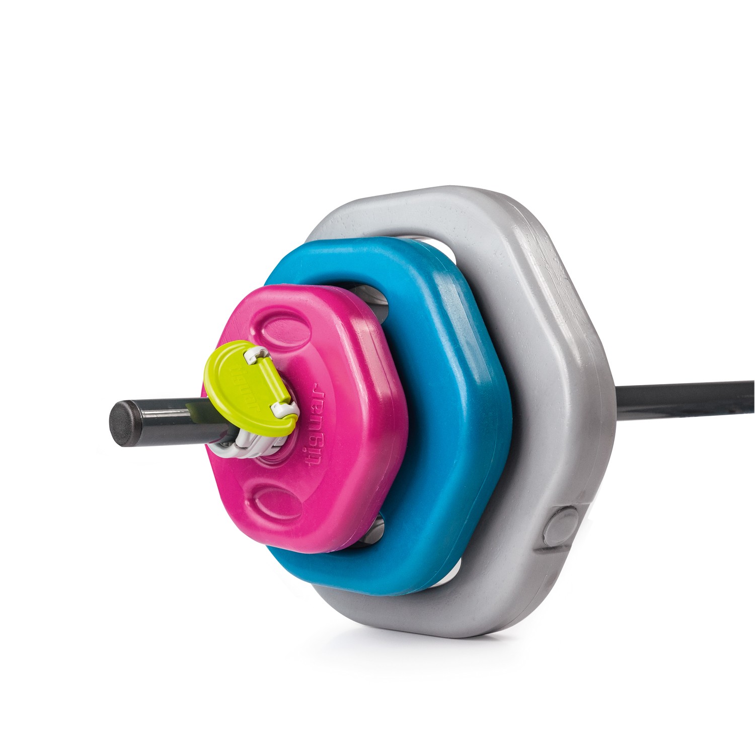 Das tiguar Pump-Set ist die perfekte Lösung für das Training in der Gruppe. Das Gewicht von insgesamt 17.6 kg lässt sich dank der Schnellverschlüsse sehr gut variieren. Robuste Materialien stehen für gute Haltbarkeit. Die hexagonalen Gewichtsscheiben lassen sich gut greifen und rollen aufgrund ihrer Form nicht weg.