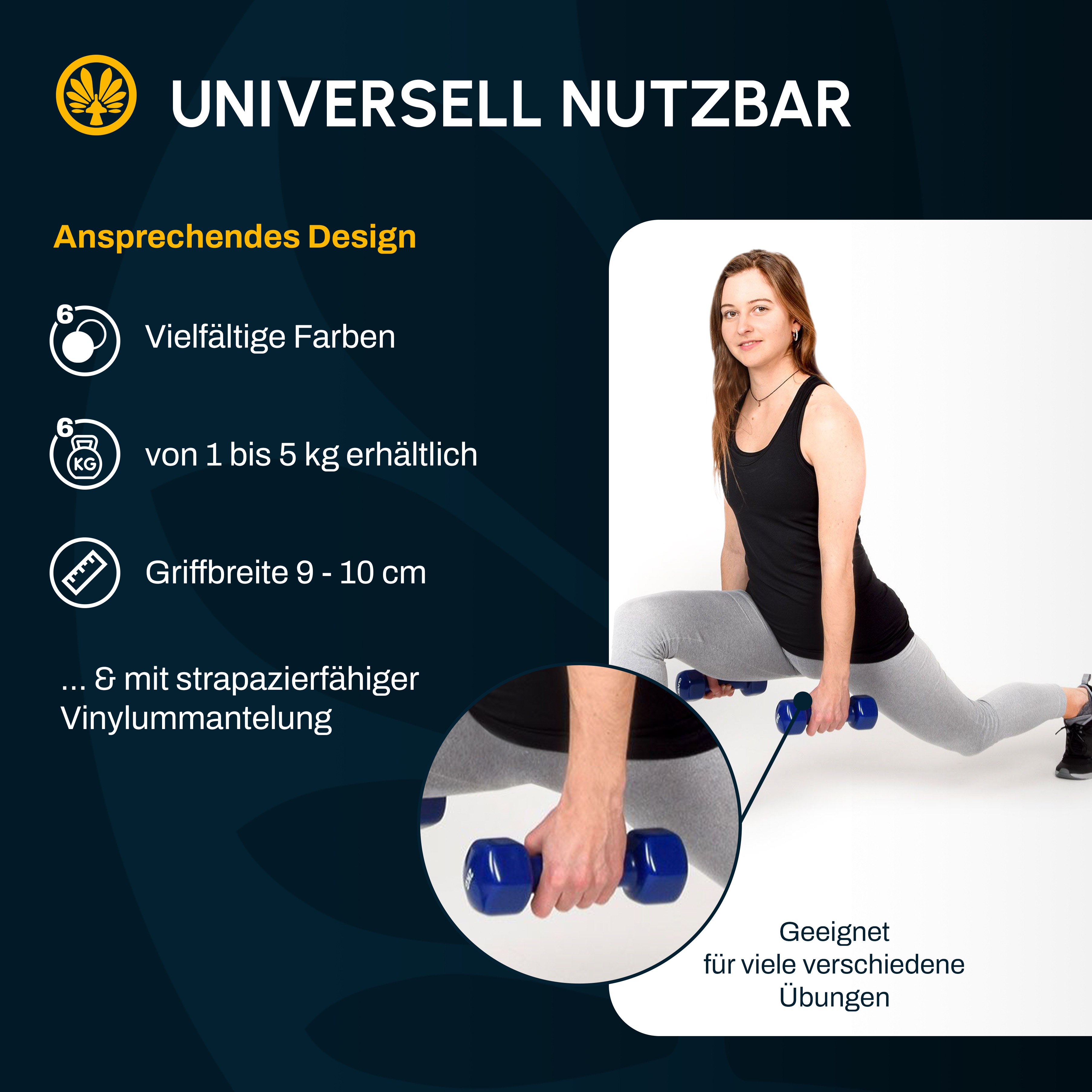 The dumbbells stand out thanks to the durable, non-slip vinyl coating, which at the same time offers a pleasant feel.