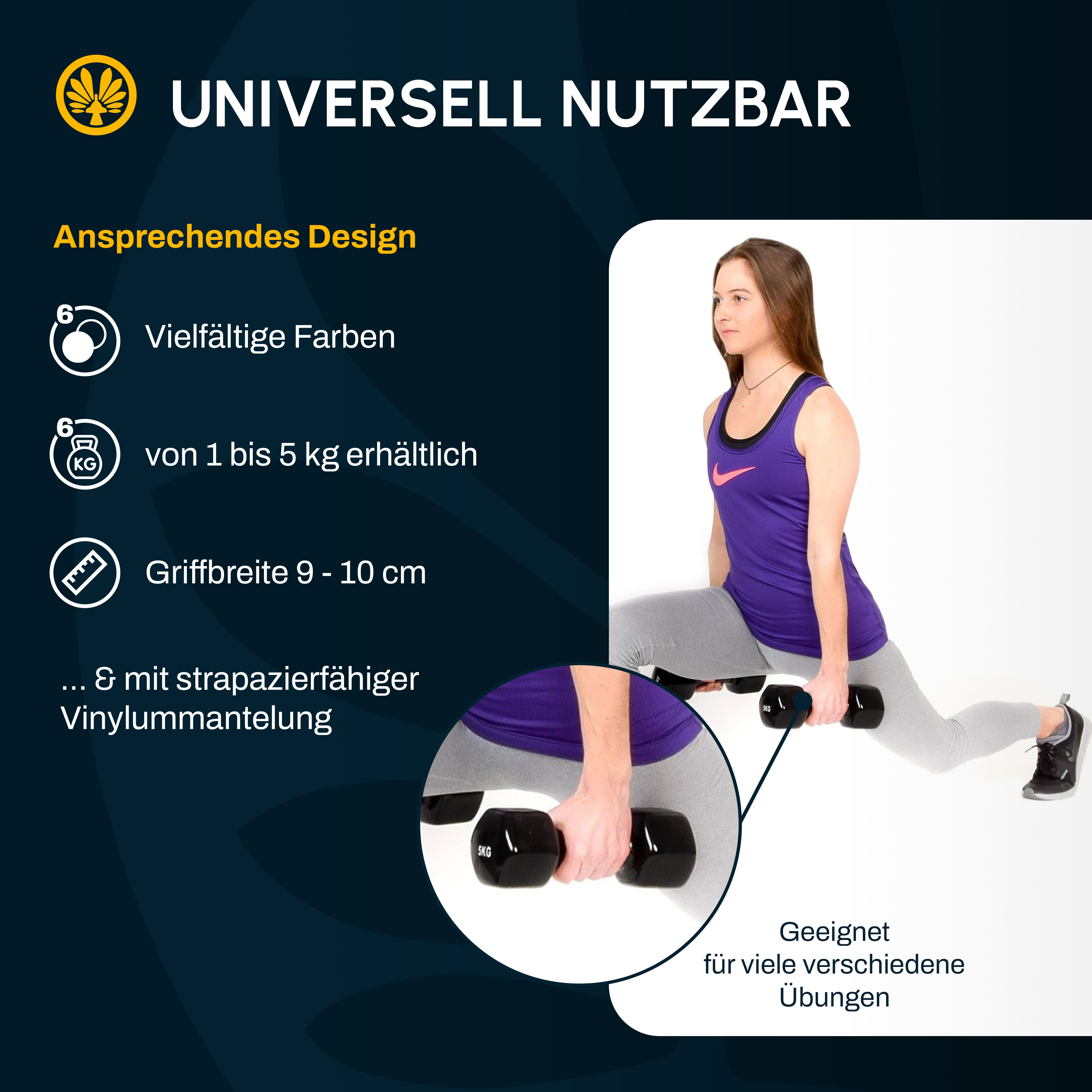 The dumbbells stand out thanks to the durable, non-slip vinyl coating, which at the same time offers a pleasant feel.