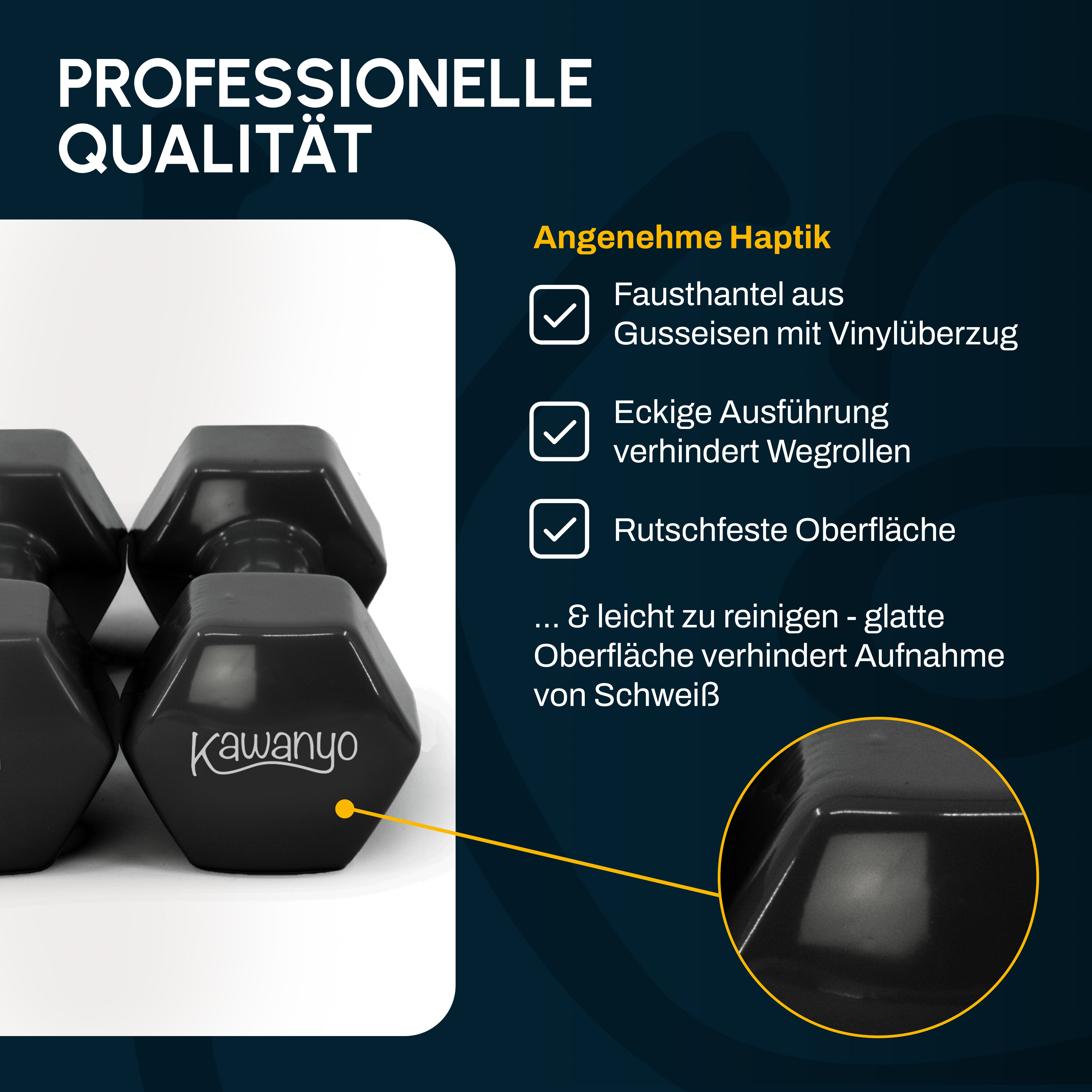 Die schwarzen Hanteln mit strapazierfähiger und griffiger Vinylummantelung sorgen für ein effektives, erfolgreiches Kraft- und Ausdauertraining. Aufgrund der handsympathischen Haptik lässt es sich angenehm und problemlos trainieren - ganz ohne Abrutschen. Durch die 6-eckige Form können die Hanteln, wenn du sie ablegst, nicht wegrollen. So kannst du dein Training immer effektiv und ungehemmt gestalten! Das Besondere an den Vinylhanteln ist zudem, dass sie unempfindlich gegen Schweiß und Kratzer sind. Außerdem lassen sich die Hanteln leicht abwischen und reinigen.