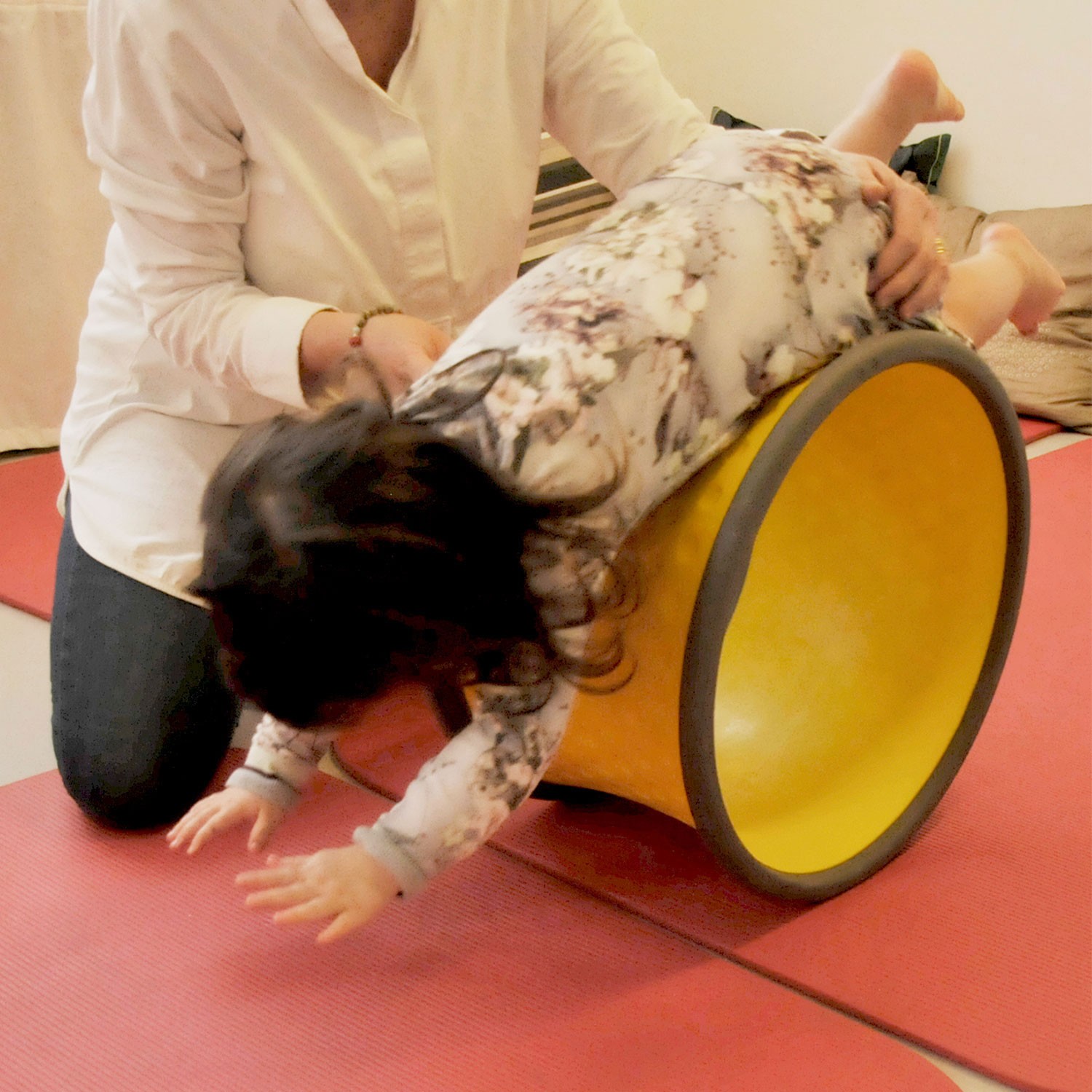 Schnell finden die Kinder heraus, dass es sich auch auf der Außenseite des Body Wheels rollen lässt. Das Rad hat eine leicht nach innen gewölbte Oberfläche, was dem Kind seitlich Halt gibt, wenn es auf der Rolle liegt und sie in Bewegung setzt. Die Form lädt auch zum rittlings Sitzen wie auf einem Pferdesattel oder zum Vor- und Zurückschaukeln in Bauchlage, im Sitzen oder in Rückenlage ein, ohne dass das Kind seitwärts abrutschen kann.