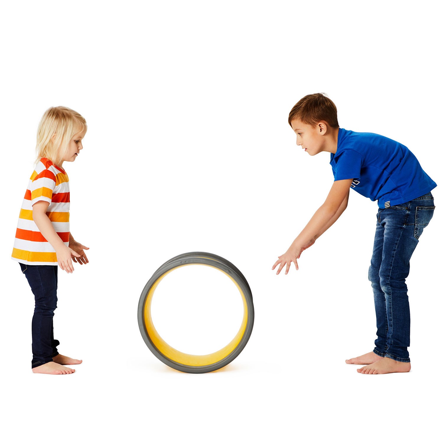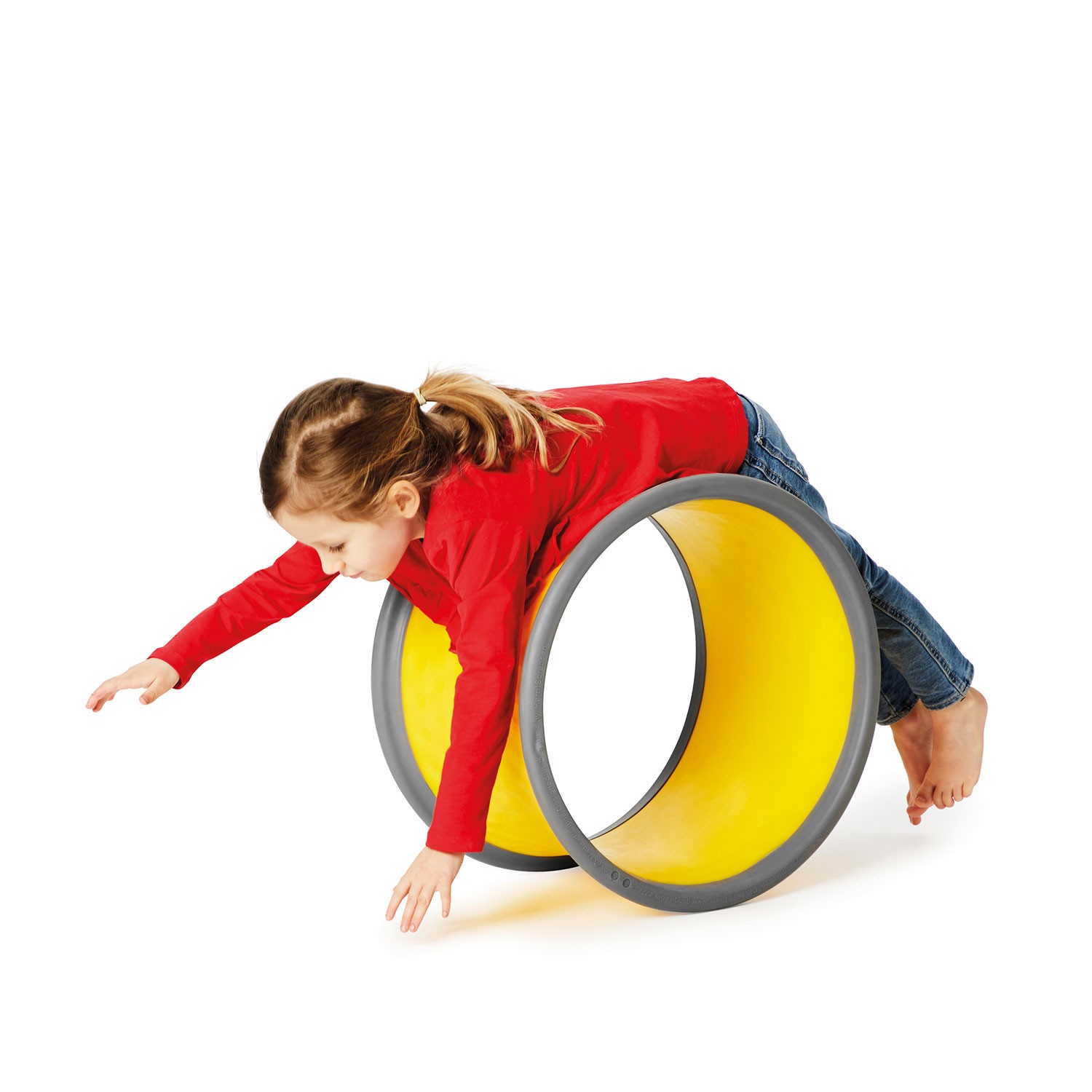 Wird das Body Wheel aufrecht gestellt, sorgen Gummikante und Gewicht für einen stabilen Stand zum sicheren Draufklettern. In dieser Position eignet sich das Wheel ideal zum Versteckspielen, bei dem die Kinder ein Gefühl für ihre Körpermaße entwickeln, wenn sie die Rolle als Höhle benutzen. Man kann auch auf dem Rand stehen und balancieren üben oder mehrere Räder der gleichen Größe übereinander stapeln.