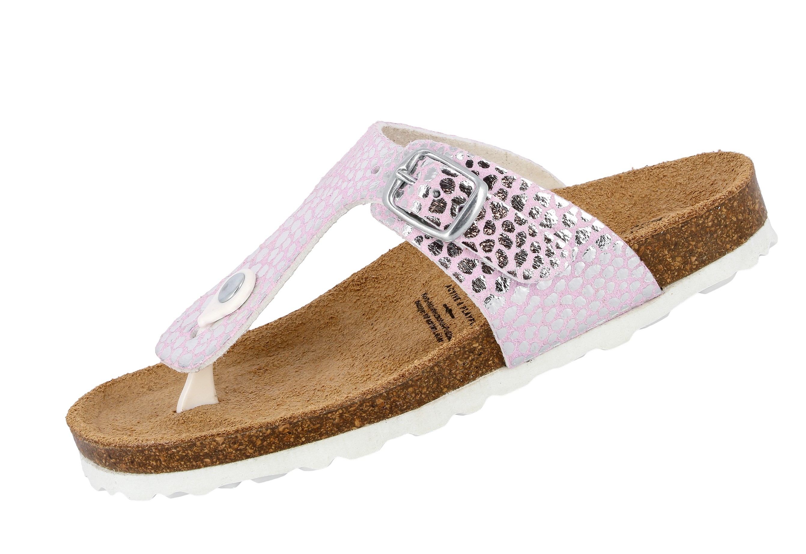 Zehenstegpantolette für Kinder in pink. Durch das ausgeprägte Fußbett aus Kork und Kautschuk mit seiner schockabsorbierenden Dämpfung, läuft es sich einfach mega bequem - quasi wie auf Wolken (Lico nennt das System Shockabsorber 'Air-Bag'). Der Tragekomfort kommt nicht zuletzt durch die Lederinnensohle.