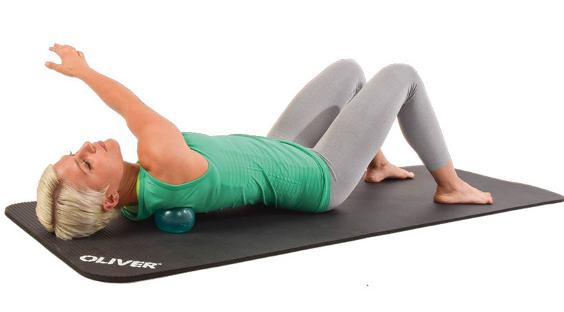 Mit dem Rücken zur Wand stehend den Ball in Schulterhöhe zwischen Körper und Wand positionieren. Jetzt den Ball waagerecht, senkrecht oder kreisend über den gesamten Rückenbereich bewegen.
