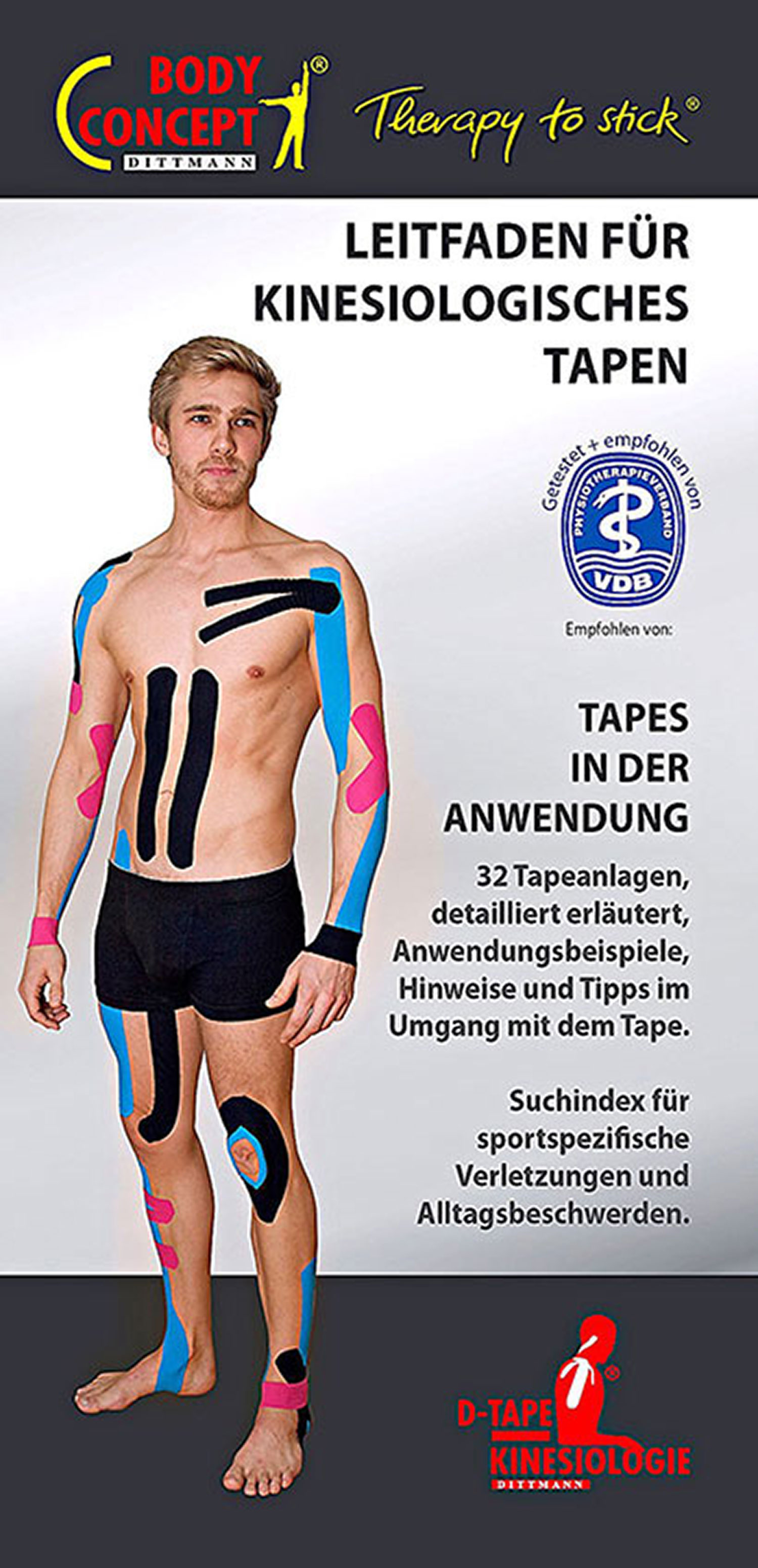 In 32 Tape-Anlagen mit dem D-Tape beschreibt der Autor die Grundtechniken, sowie Schritt für Schritt die Vorgehensweise der Tape-Anlagern bei den häufigsten Beschwerdesymptomatiken und Sportverletzungen.